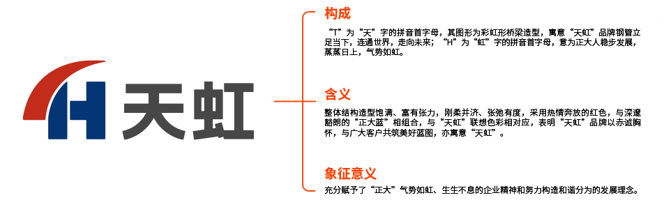 设计元素采用“T”、“H”字母造型为基本设计图形;“T”为“天”字的拼音首字母,其图形为雨后彩虹造型,集时尚、美丽、动感元素为一体;“H”为“虹”字的拼音首字母,表达了“正大人”与广大客户间兄弟相连、携手并进,共同描绘多彩未来的愿望。